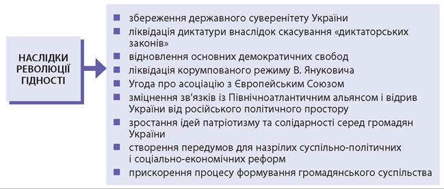 • Притягнення до кримінальної відповідальності керівників силових структур. • Відставка прем’єр-міністра М. Азарова. • Ухвалення євроінтеграційних законів. • Підписання В. Януковичем у Вільнюсі Угоди про асоціацію з ЄС. • Початок процедури імпічменту Президента. • Повернення до Конституції від 8 грудня 2004 р. 4. Поміркуйте, що дає підстави для пропонованого висновку.