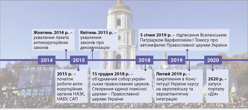 Саме реформи, які наближали Україну до європейських антикорупційних стандартів, мали стати ключовими в подоланні старої корупційно-олігархічної системи. Було створено систему спеціальних органів та підрозділів, основна діяльність яких спрямована на недопущення корупції, зменшення корупційних ризиків і забезпечення невідворотності покарання за вчинення корупційних правопорушень. У 2015 р. запрацювали Національне агентство з питань запобігання корупції, Національне антикорупційне бюро України, Спеціалізована антикорупційна прокуратура. Основна мета цієї реформи — створити в Україні нульовий рівень толерантності до корупції та чітке розуміння, що за зловживання й отримання хабарів рано чи пізно доведеться відповідати.