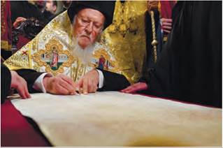 Підписання Вселенським Патріархом Варфоломієм І Томосу про автокефалію Православної церкви України. Фанар, храм Св. Георгія. 2019 р. Фото: glavcom.ua