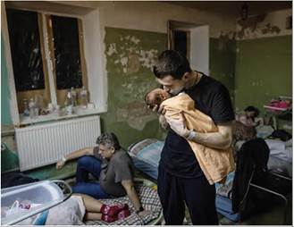 Чоловік тримає новонароджену дитину в бомбосховищі пологового будинку. 2 березня 2022 р. Київ. Фото: Chris McGrath / Getty Images