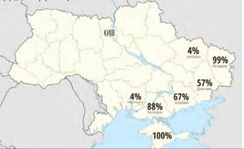 Відсоток тимчасово окупованих Росією територій України по областях на кінець 2023 р.