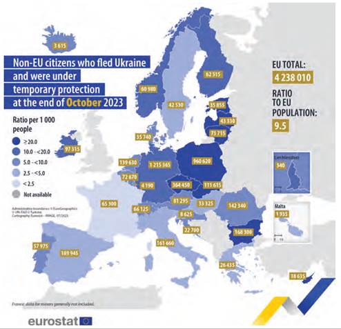 У регіонах, де зареєстровано найбільшу кількість українських біженців, місцева влада створює спеціальні координаційні штаби. Європейський Союз наголошує, що надаватиме українцям і українкам, які тікають від війни, допомогу так довго, скільки це буде потрібно. Єврокомісія наводила такі дані щодо переселенців з України у 2022 р.: «16 мли українців приїхали на територію Євросоюзу. 11 мільйонів з них повернулися. 4 мільйони залишаються. Ще 1 мільйон поїхав далі за межі України, наприклад, до Канади, США та Великої Британії». Показово, що серед тих, хто повернувся, багато хто зробив це спеціально, щоби долучитися до боротьби з російським ворогом. Водночас негативною тенденцією є намагання осіб, які здатні боротися з ворогом, виїхати до Євросоюзу, переважно незаконним шляхом.