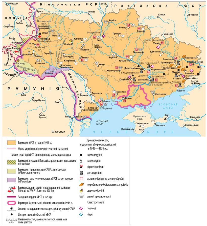 1. Яких змін зазнали територія та адміністративно-територіальний устрій УРСР у перші повоєнні роки? 2. Які промислові об’єкти відновили або реструктурували в цей період у регіоні, де ви живете?