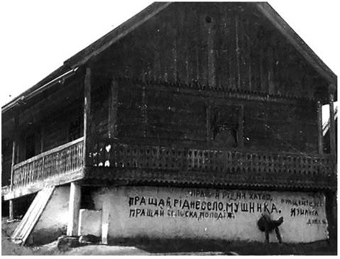 Виселення українського селянства. 1947 р. Напис на хаті: «Прощай, рідна хатко, прощай, рідне село Мушинка, прощай, сільська молодіж, прощайте всі»