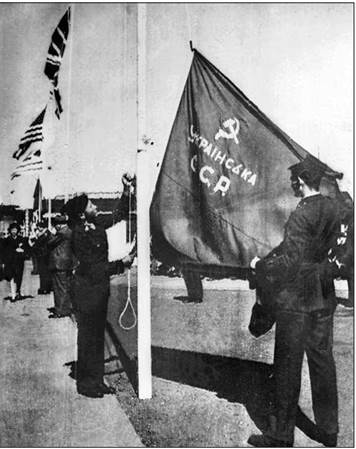 У повоєнний період в УРСР запровадили нову державну символіку — герб, прапор і гімн. Вони, як і раніше, не відповідали українським національним традиціям, а відображали символіку комуністичного режиму. Червоний прапор із написом «УРСР» замінили двоколірним: верхня частина, що становила дві третини ширини полотна, була червоною, а нижня мала світло-блакитний (лазурний) колір.