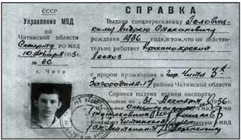 Довідка спецпоселенця, видана замість паспорта. 1955 р.