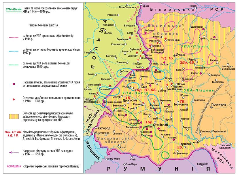8. Покажіть на карті (с. 36) місця осередків ОУН і збройного опору УПА на теренах України. 9. Скільки років пам’яті операції «Захід» у західній частині України вшановують у рік вашого навчання в 11 класі? 10. Поясніть, якими були мотиви тривалого опору УПА та націоналістичного підпілля в різних регіонах УРСР. 11. Чому радянська влада ліквідувала УГКЦ? Якою була доля її очільника?