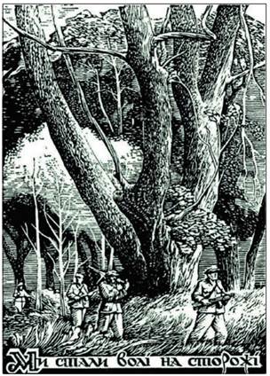 Листівка УПА. Гравюра. Художник Н. Хасевич. 1940-ві рр.