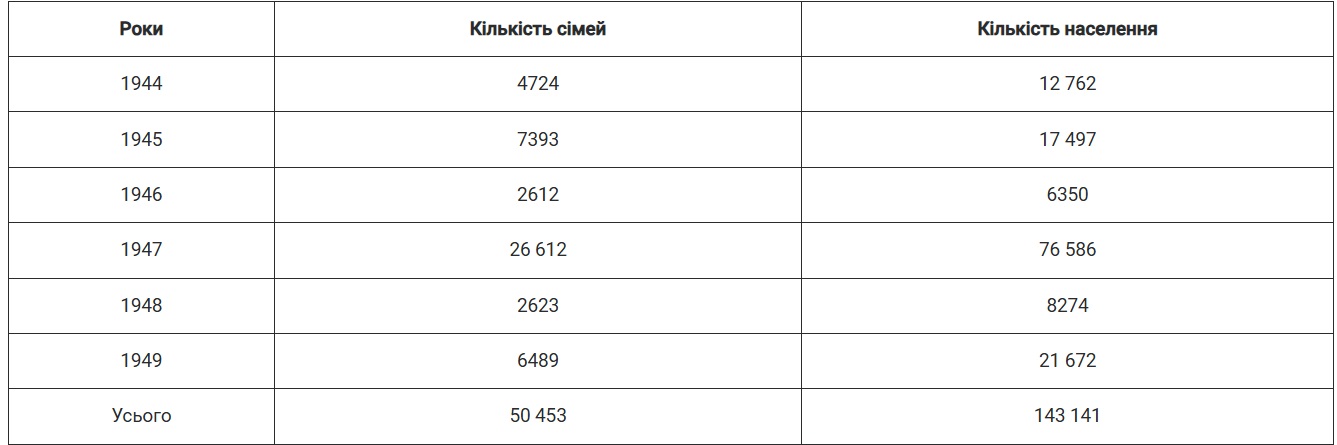 Згідно з документами, протягом 1944—1946 рр. із семи західних областей УРСР до північно-східних регіонів СРСР депортували 17 729 сімей, або 36 609 осіб. Відсутність житла, предметів першої потреби, ліків і продовольства стала справжньою катастрофою для перших депортованих осіб. Їх підселяли в будинки місцевого населення без його згоди.