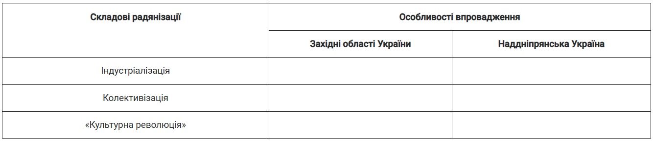 12. Визначте та охарактеризуйте передумови й наслідки депортацій українців із західних областей УРСР і південно-східних областей Польщі. 13. За допомогою методу «Кола Венна» здійсніть порівняльний аналіз операцій «Вісла» та «Захід». Визначте, що було в них спільного, а чим вони відрізнялися. 14. Охарактеризуйте наслідки радянізації західних областей УРСР та боротьби ОУН і УПА. 15. Парна робота в класі. Складіть порівняльну таблицю впровадження сталінської моделі соціалізму в західних областях України в другій половині 1940-х рр. та Наддніпрянщині в 1930-х рр.