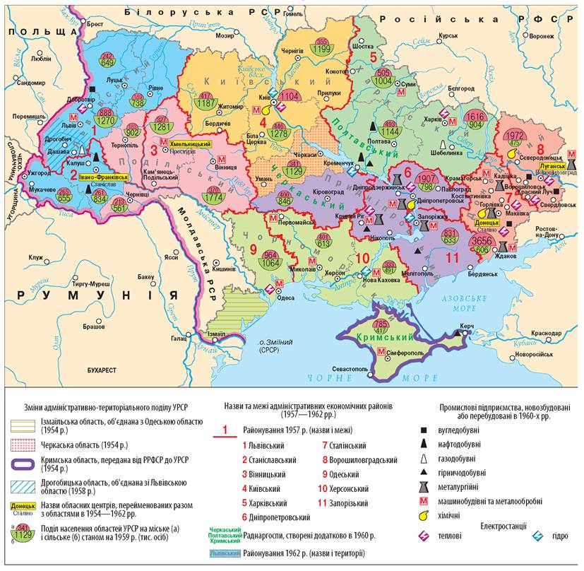 1. Покажіть на карті зміни адміністративно-територіального поділу УРСР у цей період. 2. Покажіть на карті території адміністративних економічних районів у 1957—1962 рр. 3. Які обласні центри та області перейменували в 1954—1962 рр.?