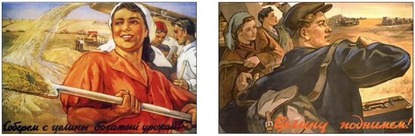 Радянські пропагандистські плакати. Написи: «Зберемо із цілини багатий урожай», «Цілину підіймемо». 1950-ті рр.