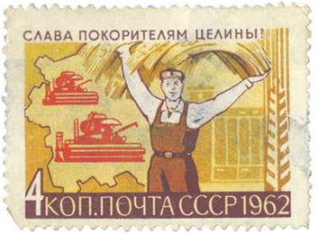 Поштова марка СРСР. Напис: «Слава підкорювачам цілини!». 1962 р.