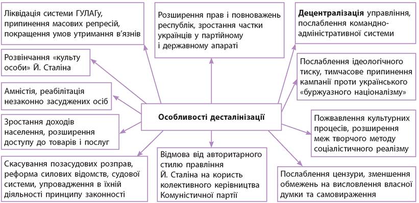 13. Визначте та обґрунтуйте, у чому полягала обмеженість процесу десталінізації. 14. Висловіть власну думку, чому певні групи засуджених українців не підлягали реабілітації. 15. Створіть дописи про процеси десталінізації в Україні в особистих щоденниках, які могли зробити представник компартійної номенклатури, робітник заводу, реабілітований український письменник (на вибір). 16. Складіть кросворд за темою «Розвиток України в умовах політичної та економічної лібералізації суспільства». 17. Підготуйте есе за темою «“Відлига”: зміни в суспільно-політичних настроях населення УРСР».