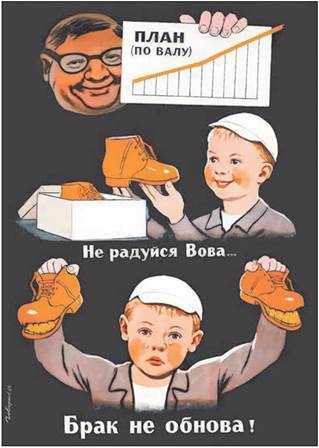 Радянський плакат «Будні планової економіки». Написи на плакаті: «План (за валом). Не радій, Вово... Брак не обнова!». 1965 р.