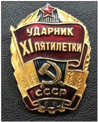 Нагрудний знак «Ударник одинадцятої п’ятирічки» СРСР, яким нагороджували осіб, що досягли найвищих показників у праці. 1981 р.