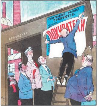 Радянська карикатура. Напис: «Текстильній фабриці потрібні: покупці». Художник І. Семенов. 1960-ті рр.