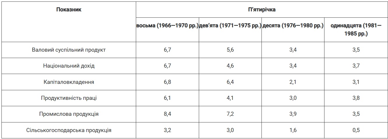 Загалом показники розвитку промисловості УРСР за 1966—1985 рр., як і економічного розвитку СРСР, постійно погіршувалися. Зростання національного доходу майже не впливало на рівень життя населення. Частка промисловості групи «А» в загальному обсязі валової продукції промисловості України в 1970—1985 рр. становила 71—72 %, а групи «Б» — 28—29 %. При цьому в демократичних країнах Заходу частка галузей, що виробляли товари народного споживання, у загальному обсязі валової продукції сягала 50—60 %.