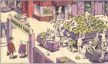 Радянська карикатура. Написи: «Овочева база», «НДІ (науково-дослідний інститут)». Підпис під карикатурою: «Щоб шефи далеко не їздили, овочеву базу побудували навколо інституту!». Художник В. Уборевич-Боровський. 1980-ті рр.