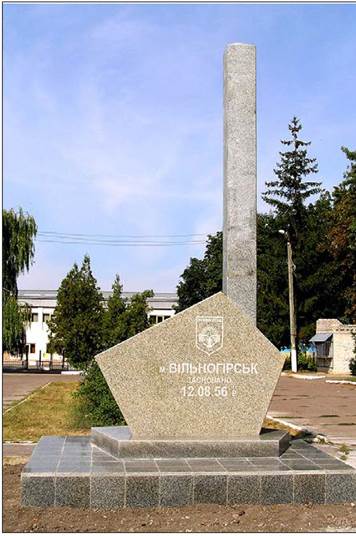 Стела на честь заснування міста Вільногірськ. 12 серпня 1956 р.