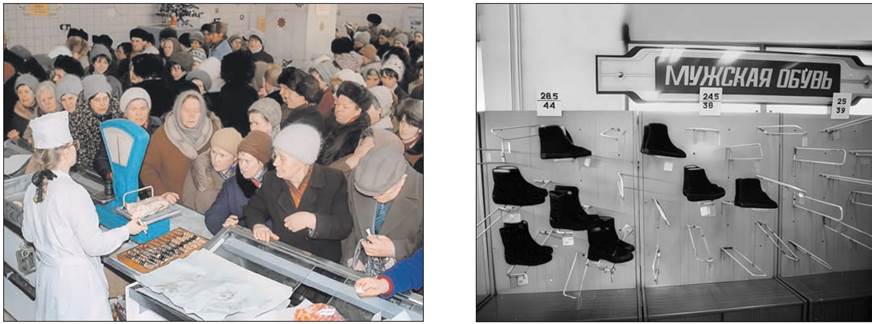 Які явища радянської дійсності відображають ілюстрації? Чому асортимент продукції був малим?