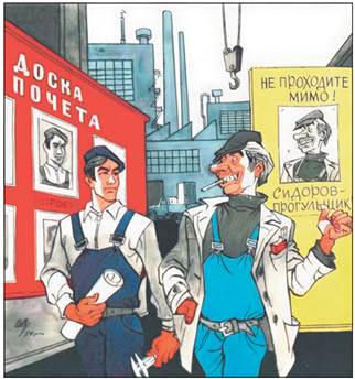Радянська карикатура: «Що з того, що ми з тобою на різних дошках, усе одно зарплати однакові!». Написи: «Дошка пошани», «Не проходьте повз! Сидоров — прогульник». Художник В. Добровольський. 1984 р.