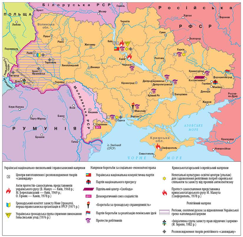 Визначте, яку інформацію про розгортання дисидентського руху в УРСР можна отримати за картою.
