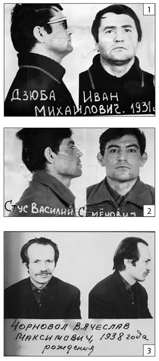 Фотографії зі слідчої справи КДБ: 1) Іван Дзюба; 2) Василь Стус; 3) В’ячеслав Чорновіл. 1970-ті рр.
