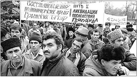 Демонстрація у Криму. Напис на плакаті: «Відновлення політичних прав кримських татар — шлях до ліквідації наслідків геноциду». 1990 р.
