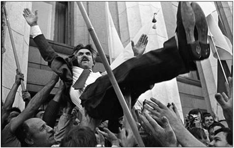 Учасники мітингу біля стін Верховної Ради підкидають догори Л. Лук’яненка після прийняття Акта проголошення незалежності України. 24 серпня 1991 р.