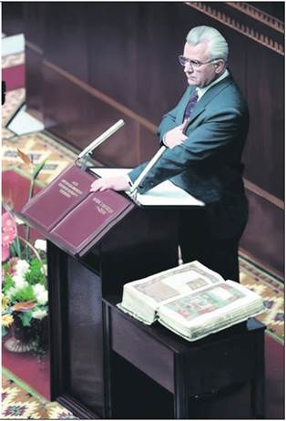 Л. Кравчук на сесії Верховної Ради приймає присягу на вірність Україні. 5 грудня 1991 р. Так було закладено традицію під час присяги використовувати Конституцію, Акт проголошення незалежності України та Пересопницьке Євангеліє