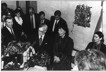 Відкриття Генерального консульства Канади в Києві. Зліва направо на передньому плані: міністр закордонних справ України Анатолій Зленко, Генеральний консул Канади в Україні Нестор Гайовський, міністр закордонних справ Канади Барбара МакДугалл. 9 вересня 1991 р.