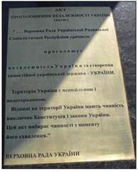 Пам’ятна табличка зі словами Акта проголошення Незалежності України на постаменті Державного Прапора України, встановленого на честь 20-ї річниці Незалежності. Зміїв (Харківська область). 2011 р.
