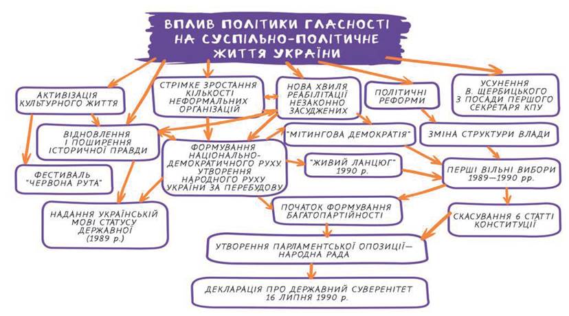 1. Які політичні та економічні проблеми були в УРСР на початку 1990-х рр.? 2. Що таке «перебудова» та «гласність»? Як вони вплинули на українське суспільство? 3. Якими були особливості українського дисидентського руху? 4. Яких успіхів досяг український національний рух до початку 1991 р.?