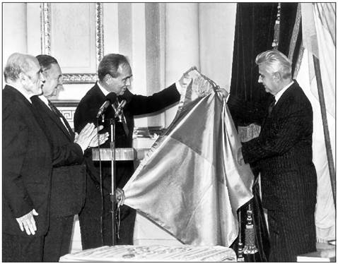 М. Плав’юк передає прапор УНР Президенту України Л. Кравчуку. Фотографія Національного музею історії України