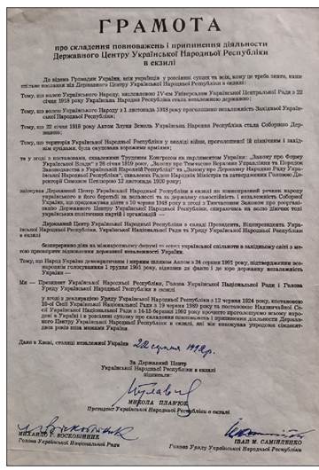 Грамота про складання повноважень і припинення діяльності Державного центру Української Народної Республіки в екзилі. 22 серпня 1992 р.
