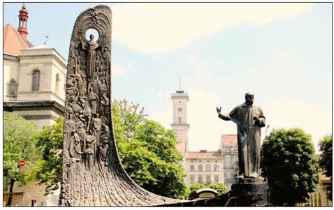 Пам’ятник Т. Шевченку у Львові, відкритий на першу річницю незалежності України. Ліворуч від фігури поета розташована 12-метрова символічна стела «Хвиля національного відродження». 24 серпня 1992 р.