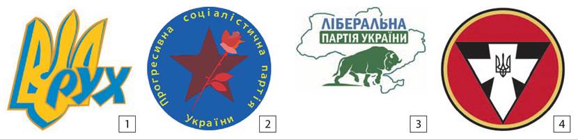 Емблеми партій: 1) Народного руху України; 2) Прогресивної соціалістичної партії України; 3) Ліберальної партії України; 4) Конгресу українських націоналістів