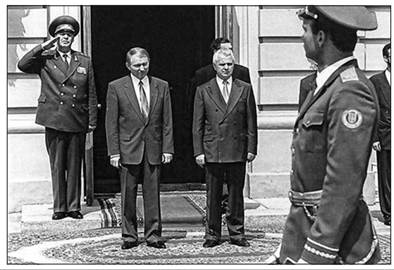 Церемонія зміни влади в Україні. Л. Кравчук (праворуч) передає владу Л. Кучмі (ліворуч). 1994 р.