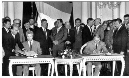 Президент України Л. Кучма і Голова Верховної Ради О. Мороз підписують Конституційний договір. 1995 р.