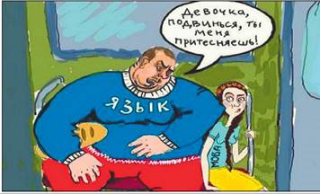 Карикатура. Написи: «Мова», «Дівчинко, посунься, ти мене утискаєш!». 2000-ні рр.