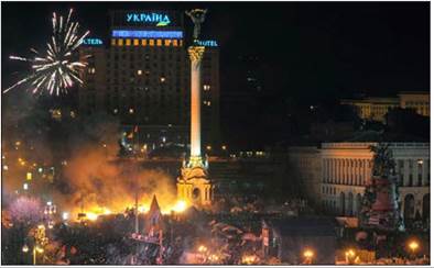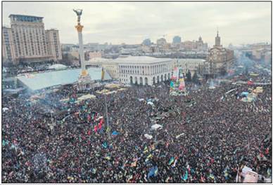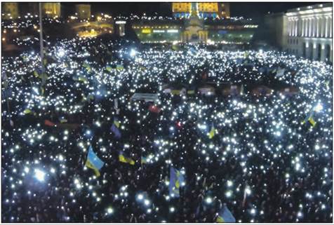 Євромайдан — масштабні акції протесту кінця 2013 — початку 2014 р. Поштовхом до протестів стала відмова уряду від європейського курсу, який українці пов’язували з реформуванням країни й поліпшенням рівня життя. Спроба уряду силою розігнати Євромайдан призвела до Революції Гідності, результатом якої стало усунення В. Януковича від влади.