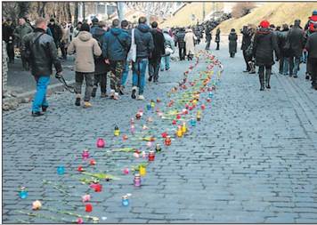 Квіти, викладені Інститутською вулицею, на вшанування загиблих Героїв Євромайдану. 24 лютого 2014 р.