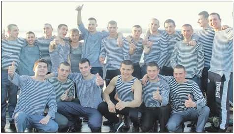 Команда корабля «Черкаси», яка найдовше чинила спротив російським загарбникам серед заблокованих кораблів ВМС України на озері Донузлав. Український прапор майорів на кораблі до 25 березня 2014 р.