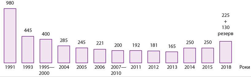 КІЛЬКІСТЬ ОСОБОВОГО СКЛАДУ ЗСУ в 1991—2018 рр. (тис. осіб)