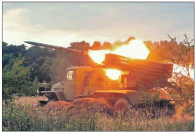 Обстріл українських позицій із реактивної системи залпового вогню «Град» із боку російського кордону. Липень 2014 р.