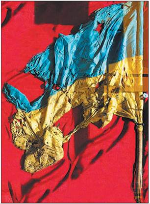 Понівечений прапор 93-ї механізованої бригади, знайдений у машині, яку було обстріляно під Іловайськом 29 серпня 2014 р.