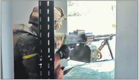 Український військовий на позиції під час першого бою за Донецький аеропорт, що відбувся 26 травня 2014 р. Незаконні збройні формування, організовані РФ на Донбасі, втратили майже половину бойовиків із 220 осіб, що намагалися захопити аеропорт. Бійці ЗСУ не втратили жодного зі 130 військовослужбовців, що брали участь у бою. Проте це був лише початок 242-денної оборони Донецького аеропорту