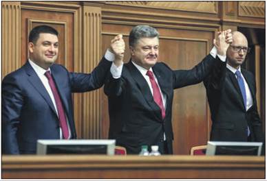 Голова Верховної Ради України В. Гройсман, Президент України П. Порошенко та Прем’єр-міністр України А. Яценюк. 2015 р.
