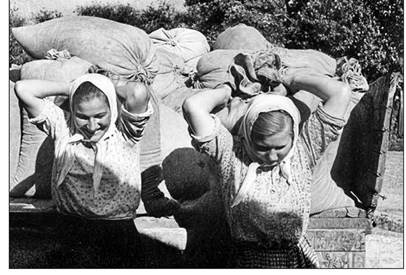 Жінки розвантажують зерно на пункті «Заготзерна». 1946 р. У 1947 р. лише у вугільній і металургійній промисловості жінки становили 35% від загальної кількості робітництва
